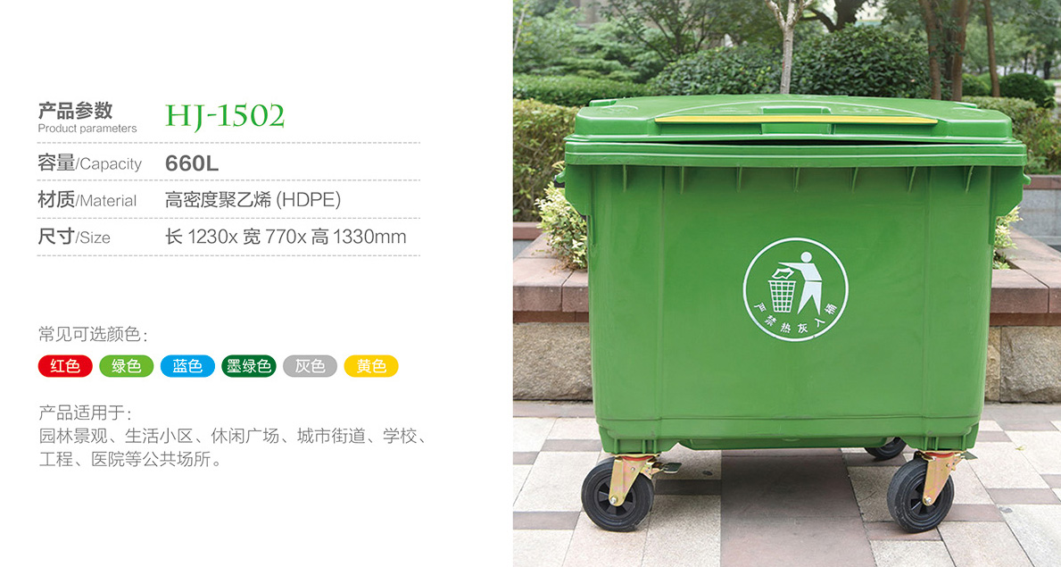 1、單個內桶容積為660L,采用HDPE 高密度聚乙烯,原生料一次注模成型,市場通用性強,具有較好的耐酸、耐堿、耐腐蝕等性能。同時內桶可與垃圾清運車配套,清理過程中輕松、方便、快捷。