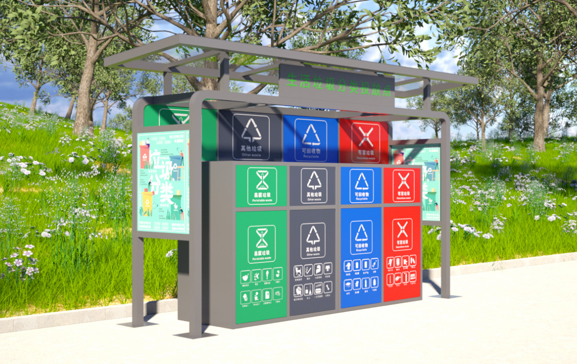 10、宣傳牌:側面設置垃圾分類宣傳牌,它可以起到宣傳教育、引導、美化環境和公益推廣的作用,有助于提高人們的環保意識和參與度,促進垃圾分類的規范化、標準化和普及化。